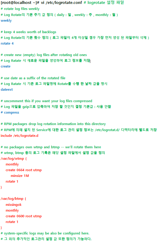 - "/etc/logrotate.conf" 설정파일에 정의된 "Include /etc/logrotate.d" 설정에의해 "/etc/logroate.d/" 디렉터리를 호출